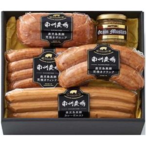 粗挽きにした黒豚肉のウィンナー、フランクフルト、ボロニア、細かく挽いたカレーヴルスト、ソーセージをより一層引き立たせるグレインマスタードのセットです。