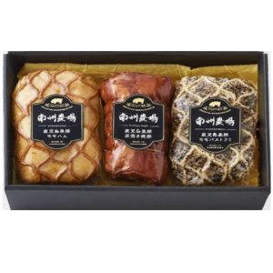 自家農場で大切に育てた鹿児島黒豚を原料に製造した地元の炭で焼いた黒豚、さくらのチップでスモークしたモモハム、スパイシーに仕上げたモモハムパストラミの3点セットです。